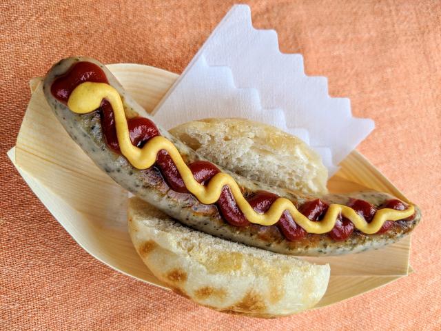 【メニュー:ソーセージドッグ(2種)¥600/ソーセージ盛り合わせ¥1100/カレーソーセージ¥650/レバーパテ¥500】⼿作りソーセージ⼯房を持つドイツ ⼈がキッチンカーで登場!!国産の豚⾁と天然の⽺腸を使⽤し、無添加でありながら本場ドイツの味のソーセージです。