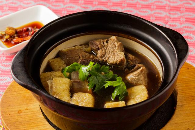 【秋の味覚メニュー:蓮根とキノコの肉骨茶(バクテー)ライス付き¥1400】マレーシアの名物料理。秋のお野菜とじっくり煮込んだ豚肉の骨付きリブに、漢方やスパイスをブレンドしたスープがしみ込んだ滋味深い一品です。にんにくの香りと薬膳のコクが合わさり、体の芯から温まります。白ご飯と一緒に食べるとさらに本場の味わいに!