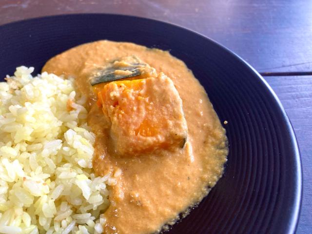 【秋の味覚メニュー:パンプキンポタージュカレー¥1100】秋の味覚王道パンプキンカレー! クリーミーに仕上げた野菜ペーストに、カボチャの甘さ、さらにスパイスの香り豊かな仕上がりです。 副菜のキノコサブジと合わせてお召し上がりください。