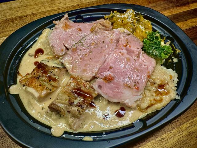 【秋の味覚メニュー:ポルチーニ茸香るクリームリゾットとローストポーク¥1100】イタリア秋の味覚をお楽しみいただけます。ホワイトソースにポルチーニ茸の香りを纏わせ芳醇な香りに仕上げてます。付け合わせは、香辛料を駆使したスパイシーなカボチャサラダです。仕上げにお馴染みのローストポークも乗せランチにしてはちょっと贅沢なお弁当に仕上げました。