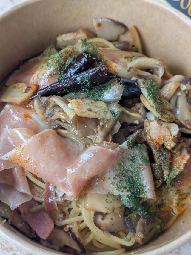 【秋の味覚メニュー:生ハムと4種キノコトリュフ香る濃厚ペペロンチーノ¥1100】キノコ達のコクある風味、生ハムの塩味と辛味のアーリオオーリオ、そこにトリュフのリッチな香りをつけた旨味パスタ! Buono!