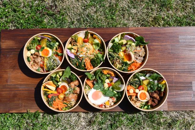 【秋の味覚メニュー:秋の味覚サラダボウル¥900~】かぼちゃやさつまいもなど、湘南を中心に集めた秋の新鮮な野菜をふんだんに使用。 5種類の世界の味わい豊かなおかずと組み合わせたサラダボウル! ランチにぴったりの一皿で、秋の美味しさをぜひお楽しみください。