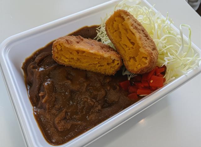 【秋の味覚メニュー:俺の昭和カレーかぼちゃコロッケトッピング ¥900】サクサクパン粉で仕上げた甘さたっぷりかぼちゃコロッケです。