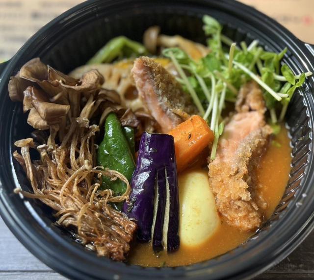 【秋の味覚メニュー:『北海道産秋鮭のフライ、キノコたっぷり秋の味覚満載と野菜、玉子のスープカレー』¥1500】北海道の旬の秋鮭とキノコたっぷりで秋の味覚を存分に味わって頂ける逸品となっております! 全てを自家製にこだわり、食材の旨みを余すことなく楽しんで頂けます。