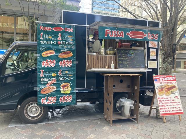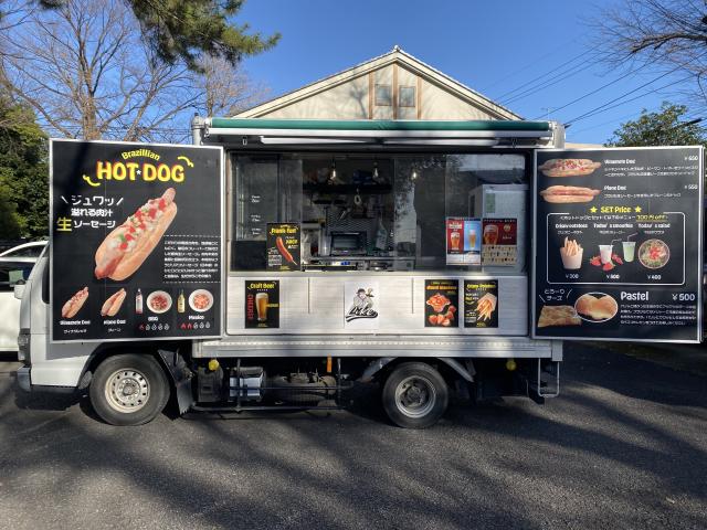 【メニュー:ホットドッグ2種(プレーン サルサwithチーズ)/BIG DOG/アイスコーヒー/チェリーソーダ/レモンスカッシュ】自慢の手作りパンに国産豚100%のソーセージを挟み、クリームチーズ、手作りサルサソースをかけたこだわりの逸品、福生ドッグをご提供いたします!