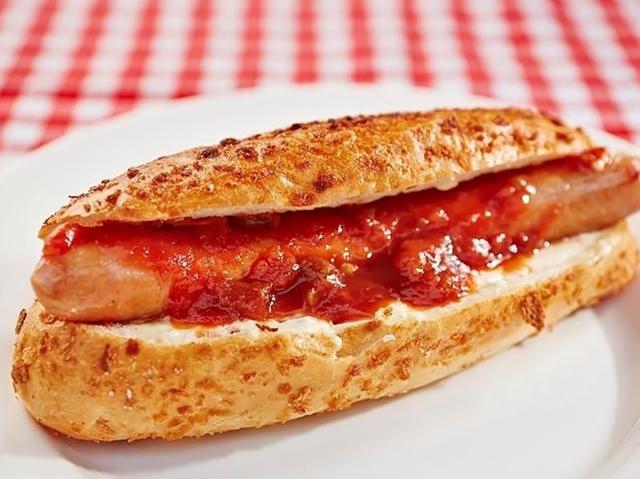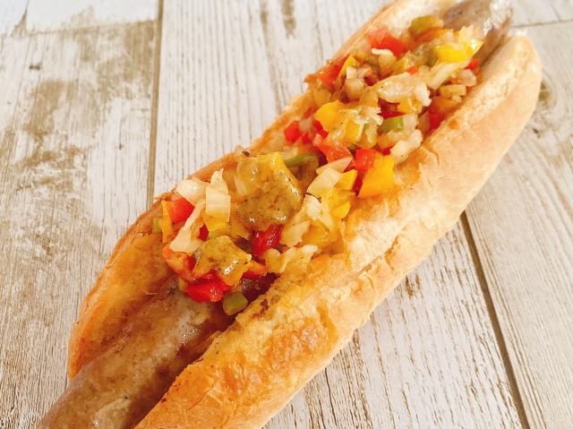 【メニュー:ブラジリアンホットドッグ/リングイッサ/ポテト/ドリンク】ラジルソーセージ(国内製造)をソフトフランスパンに挟んでブラジルではシュラスコを⾷べる際に お⾁にかける、ヴィナグレッチという⽟ねぎ・パプリカ・ピーマンなどを刻んだ酸味のあるソースをか けてジューシーなソーセージでも後味さっぱりといただけます。