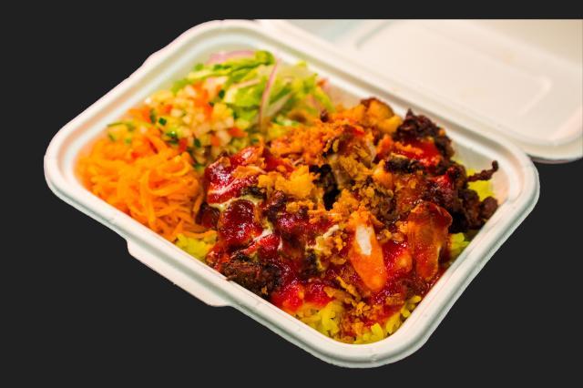 【メニュー:チキンオーバーライス¥850/プルドポークオーバーライス¥850/ファラフェルオーバーライス¥850/チキン・プルドポーク¥950/チキン・ファラフェル¥950/プルドポーク・ファラフェル¥950/チキン・プルドポーク・ファラフェル¥1050】