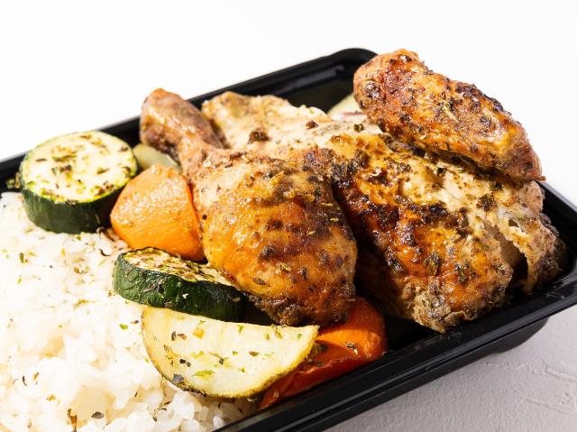 【メニュー:ロティサリーチキン】 オリジナルスパイスで味付けしたロティサリーチキンと肉汁が染み込んだグリル野菜をハーブライスでお召し上がり下さい。