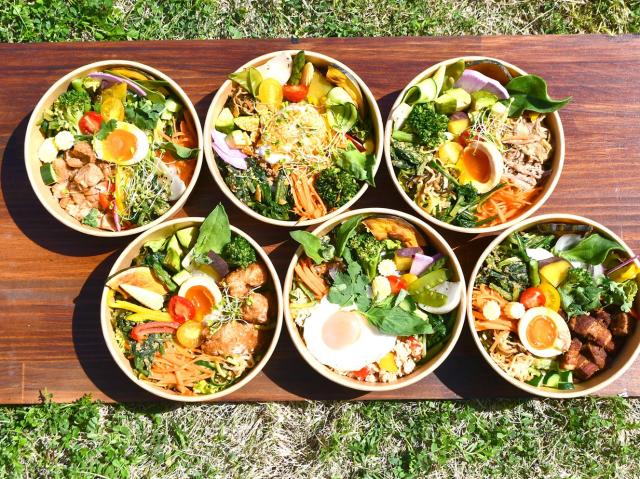 【メニュー:酵素玄米の健康弁当¥900/豆腐ハンバーグのロコモコ丼¥850/大豆ミートのタコライス¥850】