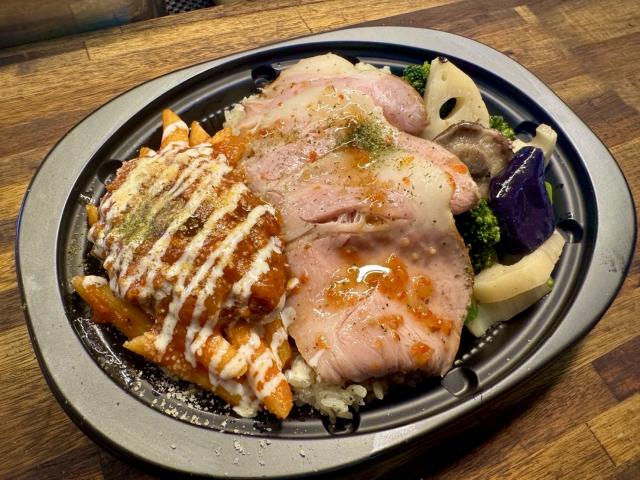 ローストポーク専門店のローストポーク丼は低温調理で時間をかけているのでしっとりやわらか!ソースはにんにくしょうゆ・オニオンペッパー・和風おろしの3種類からお選びください。