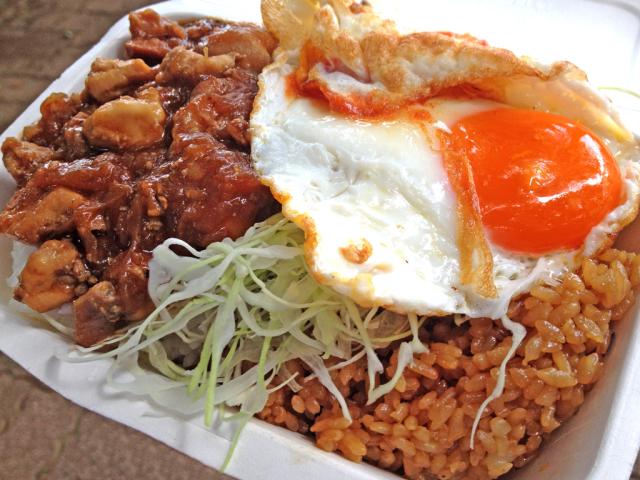【メニュー:ナシゴレンとスパイシー鶏ハーフ丼/スパイシー鶏丼/ローストビーフ丼】 ジュリーズスパイスが紹介するナシゴレンやオリジナル甘辛丼です。一度食べたらクセになりますよー。ボシュ―ム満点。ご飯少な目、モリモリ野菜に変更するのがお勧めです。