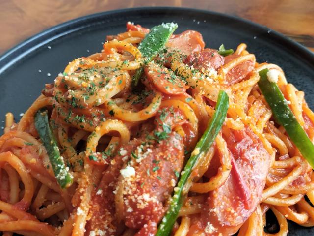 【メニュー:ナポリタン/月見ナポリ/茄子ナポリ/チョリソーナポリ/ハンバーグナポリ/ナポリセット(ナポリタン+ハンバーグ+ライス)】鉄板で焼き上げるなつかしの太麺ナポリタン!