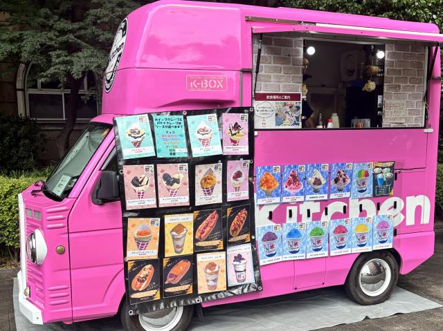 【メニュー:クレープ¥500~900/ホットコーヒー・ホットティー¥300】可愛いビビッドカラーのキッチンカーで美味しいクレープを移動販売。季節限定メニューや特別メニュー、トッピングも充実。