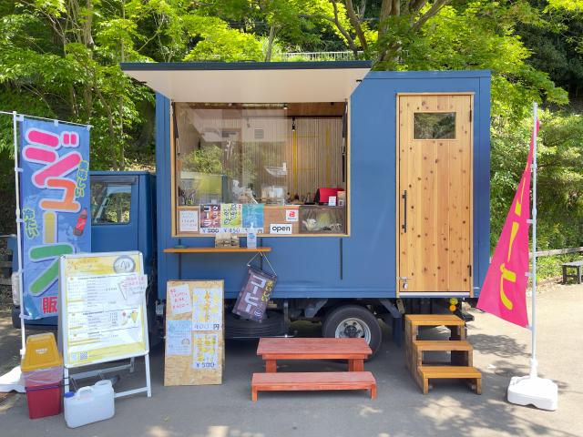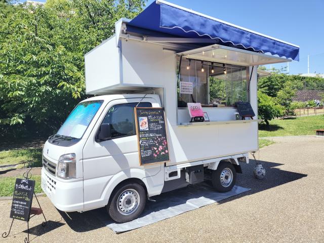【メニュー:クレープ各種】青と木の落ち着いた色合いと一風変わった車体が自慢です。