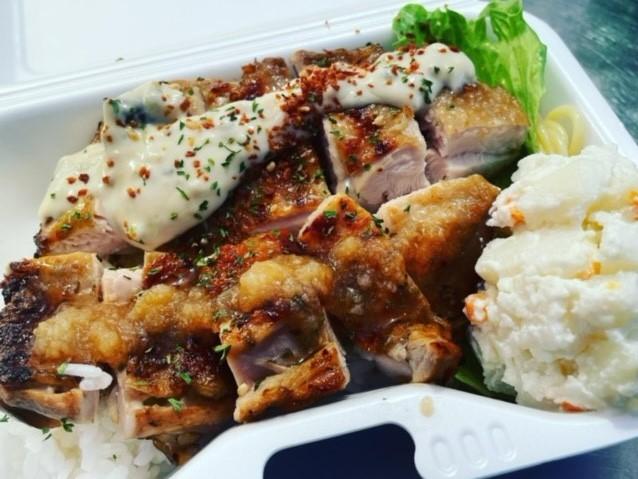 【メニュー:モチコチキン】甘めのタレに漬け込んだチキンのモチコ(もち米粉)をつけてからっと揚げました!!ハワイの家庭の味、お好みのソースで召し上がれ!