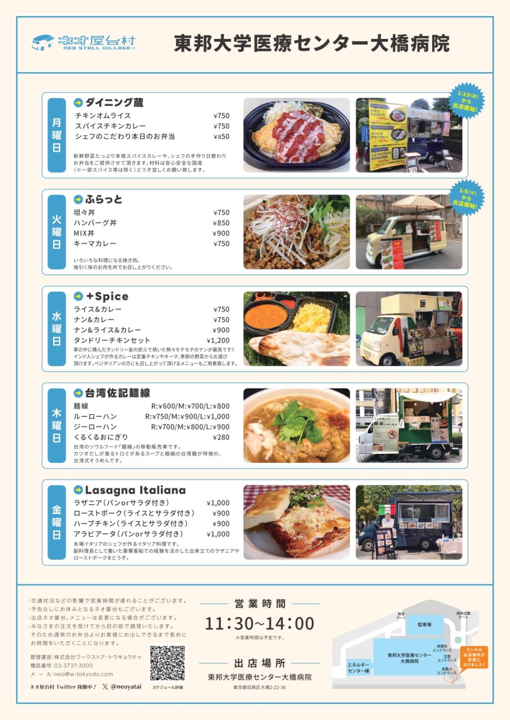 ご注意:お店・メニューなどは変更になる可能性がございます。予告なしにお休みとなるお店もございます。交通状況などにより、営業時間が遅れることがございます。