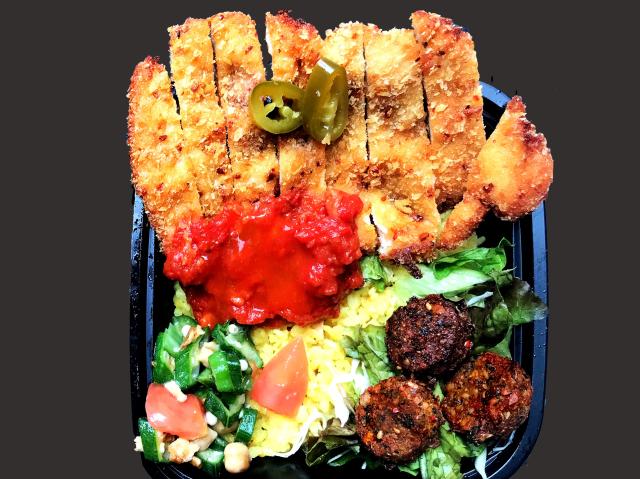 【メニュー:サルサ丼/3点盛り/鶏もも煮込み/シュニッツェル&鶏もも煮込み/菜食ごはん】 中近東料理。スパイスを効かせた本場ファラフェル&シュニッツェル(チキンカツ)をご提供します!