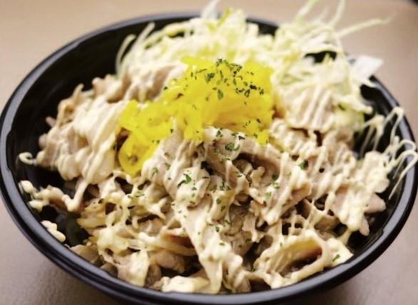 【メニュー:笑い豚丼(キムチ・サルサ・ネギ・おろし)¥850~】一度食べたら笑いが止まらなくなる豚肉料理をご提供。一番人気の笑い豚丼を食べたら、病みつきになること間違いなし!!